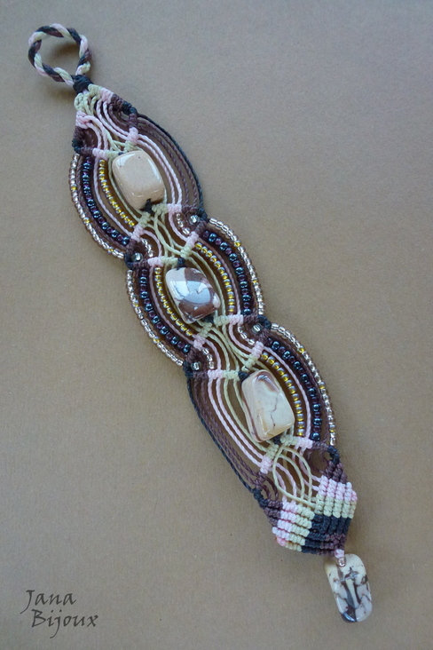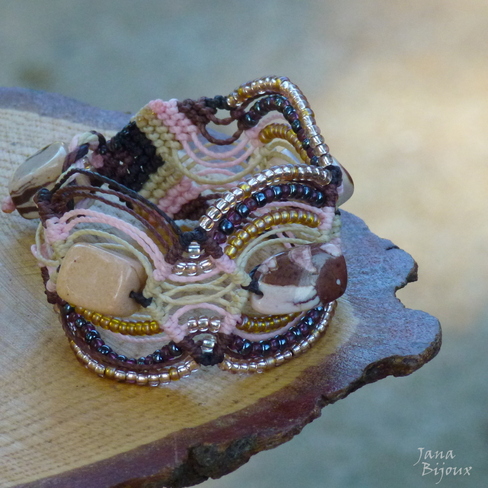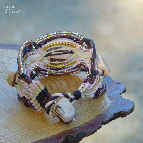 Pulseira grossa de macramé, fios em tons: rosa, bege e 2 tons de marrom. Pedras naturais de jaspe zebra e miçangas metálicas.