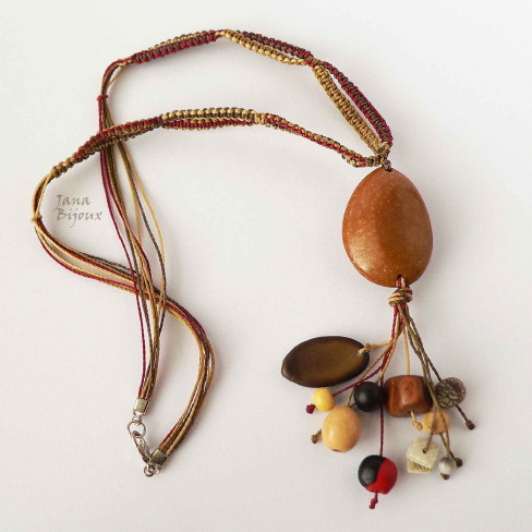 STŘEDNĚ DLOUHÝ NÁHRDELNÍK S MAKRAMÉ, DŘEVEM,MUŠLÍ A SEMÍNKY 255 Kč.
