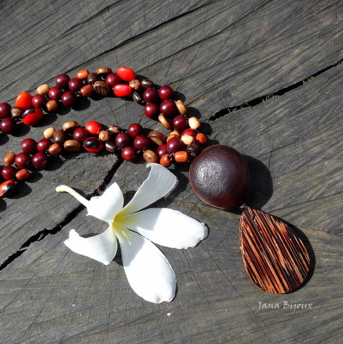 O medalhão mede 6 cm e é leve, de madeira ornamental, nobre, acho que é palissandro. Todo furado, “costurado” com fio principal do colar e encerado.