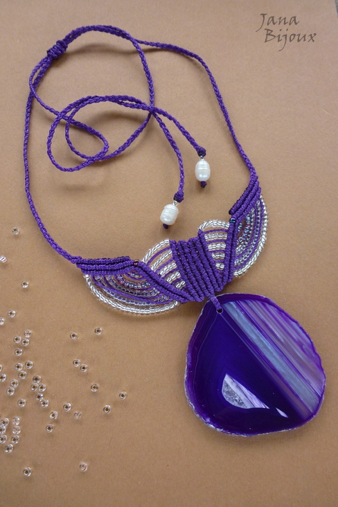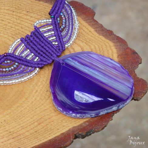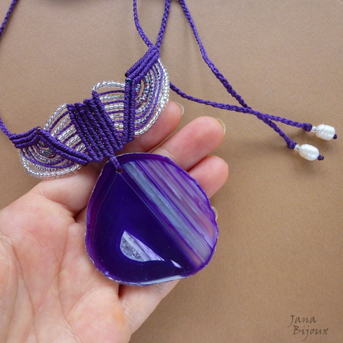 Colar com comprimento ajustável, de macramé e pedra de vulcão.
