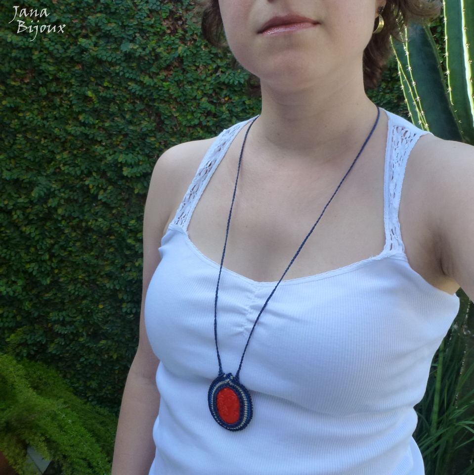 Colar com comprimento regulável, macramé, pedraria, pérola grande natural, cerâmica feita a mão e sem nenhum metal.