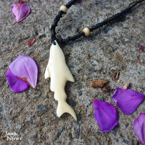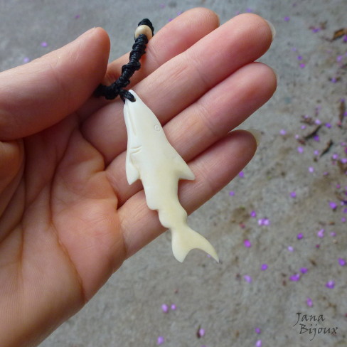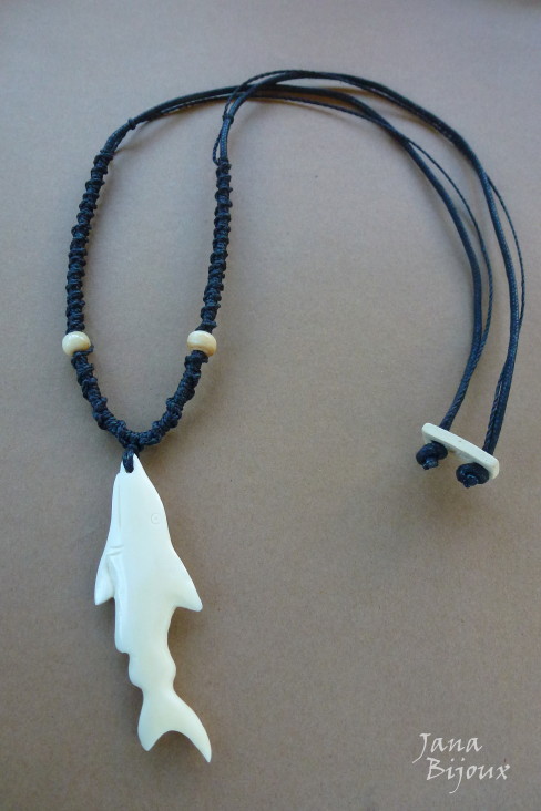Colar de comprimento médio com tubarão esculpido no osso de búfalo (Indonésia) e fios pretos com macramé. 2 peças nas laterias são tmb de osso, acabamento em cerâmica na mesma cor com iniciais JB e nós. Colar não tem fecho, comprimento é 62 cm ,verifique se passa pela sua cabeça antes de comprar :-) pela minha passa ! R$ 33,00 PEÇA ÚNICA