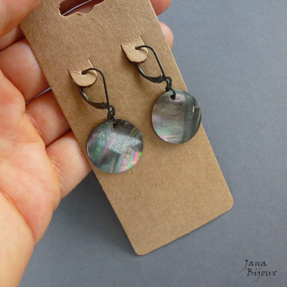 z106 08/12/2016VENDIDOS ( Prodáno)Jana Bijoux Brincos menores, delicados de margaritiferas (concha de água doce) cinza furta-cor e fecho de zinco preto. Comprimento 4 cm, moeda de concha tem 2 cm, super leve, discreto mas chique. R$ 15,00