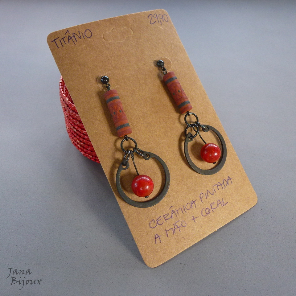 Brincão 6,5 cm com cerâmica pintada a mão e coral, fecho de titânio com tarracha e aneis industriais R$ 29,90