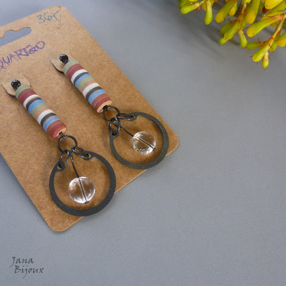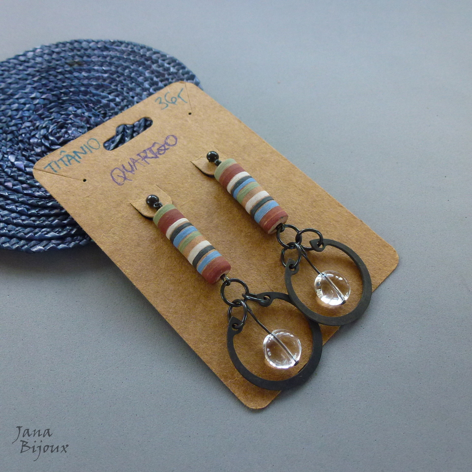 z139 09/05/2018VENDIDOS ( Prodáno)Jana Bijoux Brincão 6,5 cm com cerâmica pintada a mão e quartzo que maravilhosamente reflete luz e ilumina rosto da sua dona, fecho de titânio com tarracha e aneis industriais R$ 36,00
