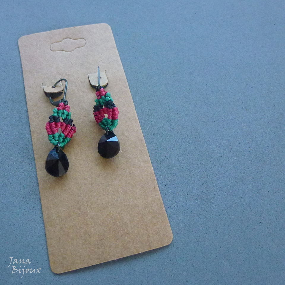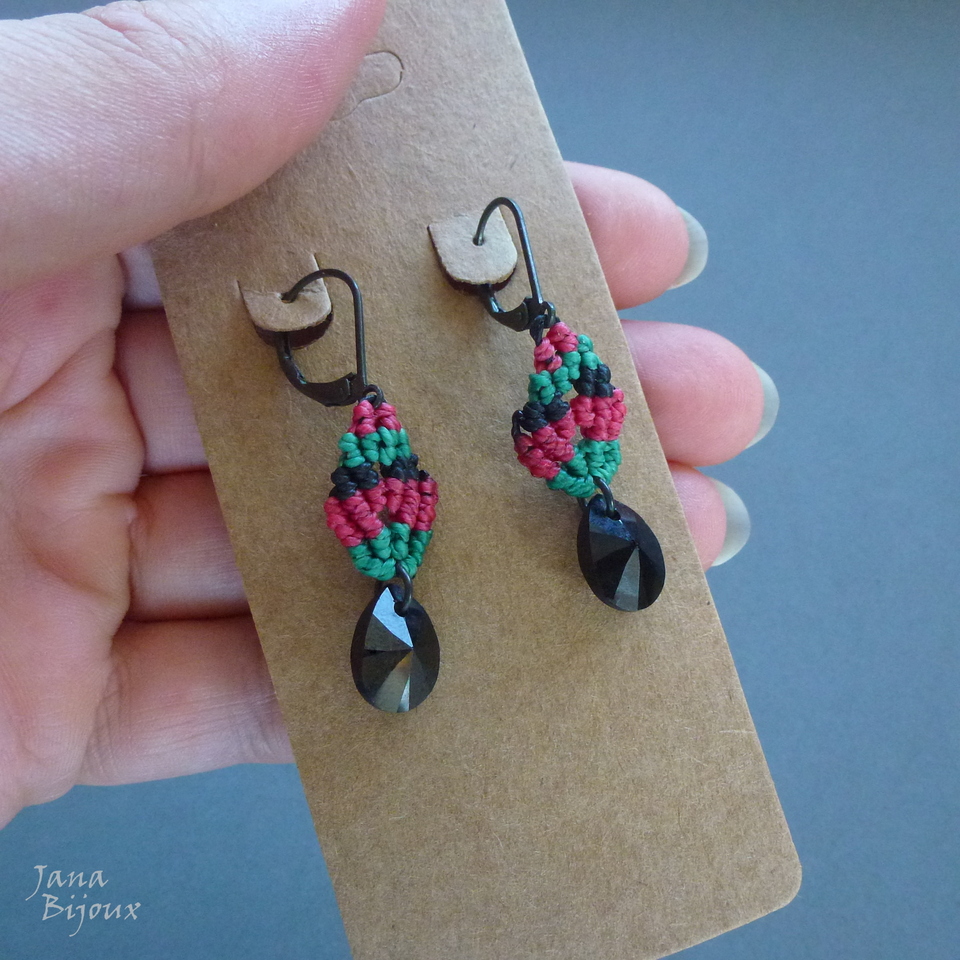 Delicado, leve, folhas de macramé num par de brinco com cristal Swarovski preto e fechos pretos. Comprimento 4,5 cm R$ 26,00