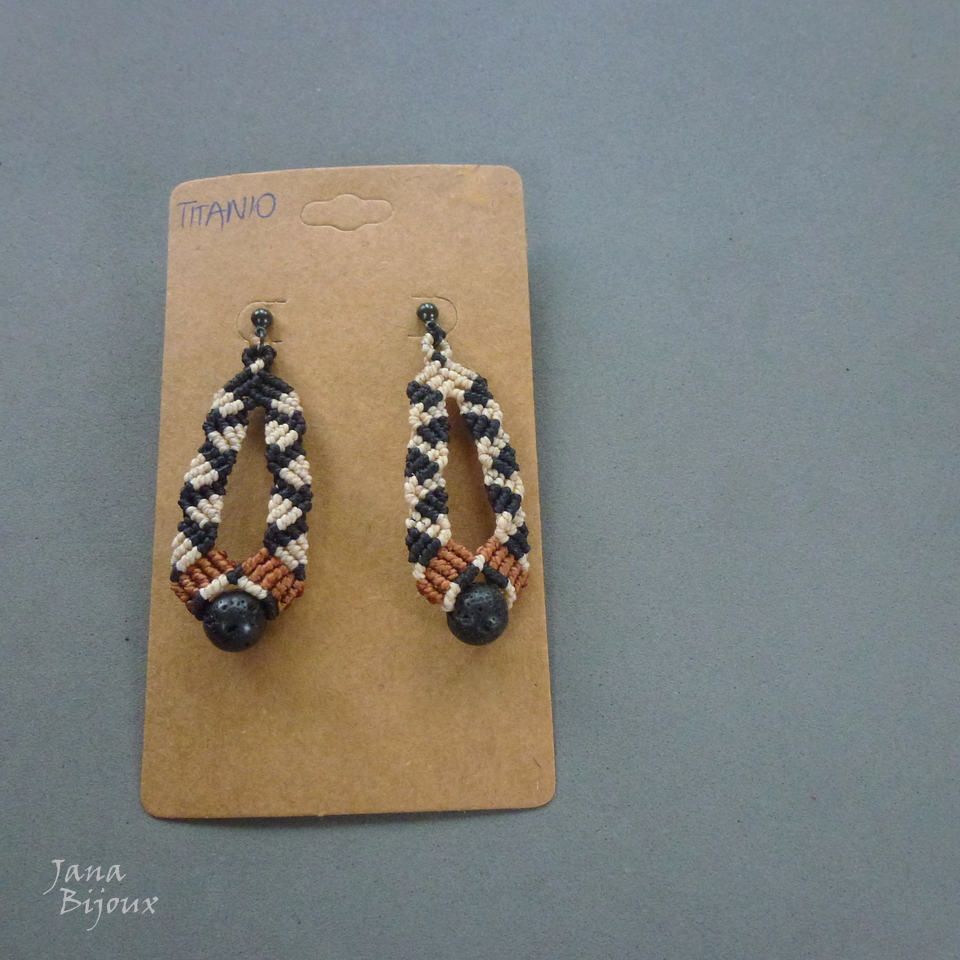z189 18/12/2022VENDIDOS ( Prodáno)Jana Bijoux Brincos grandes 6,4 cm de macramé e pedras naturais de vulcão, com sequêcia de cores de fio invertida no cada lado. Tons preto, offwhite e marrom tabaco, fecho de titânio. R$ 32,00 Possível tmb na versão simétrica sob encomenda.