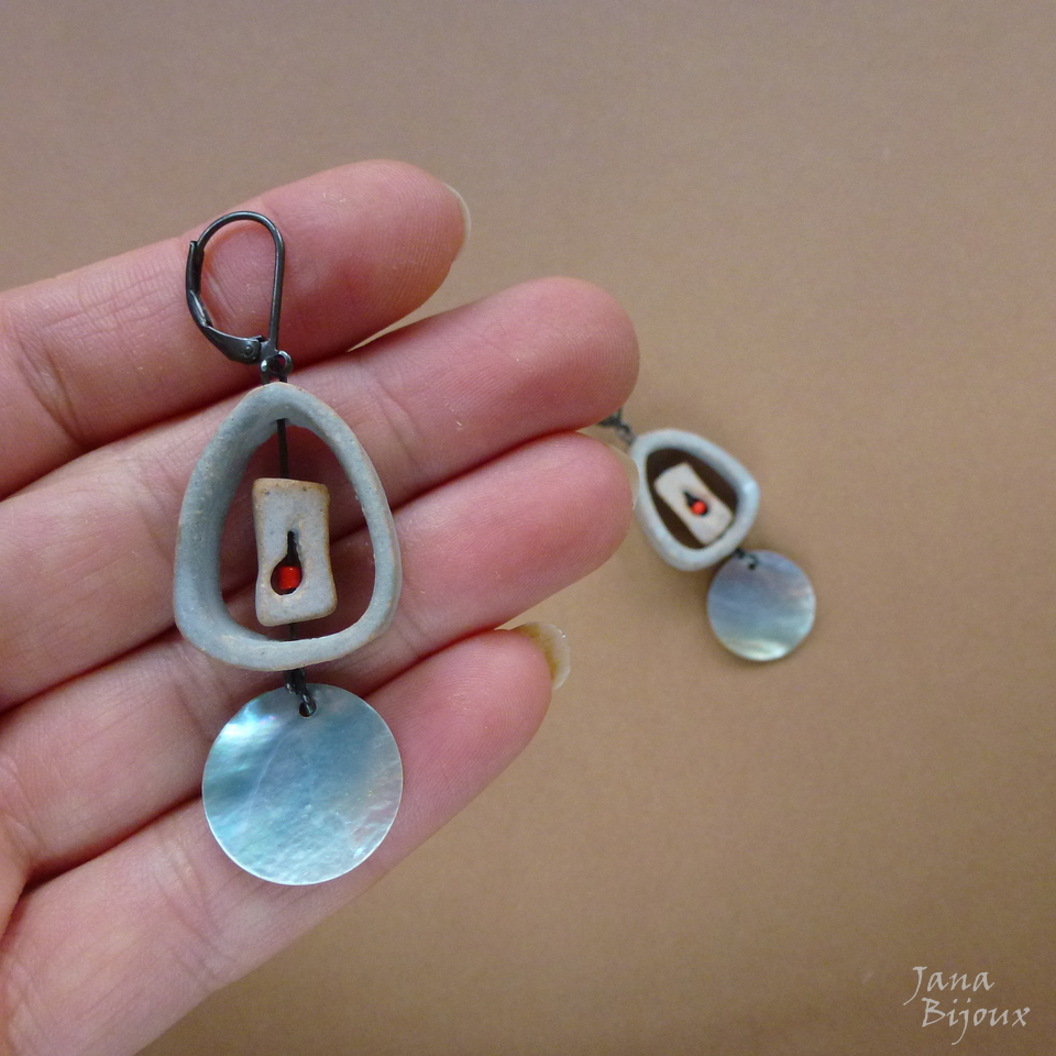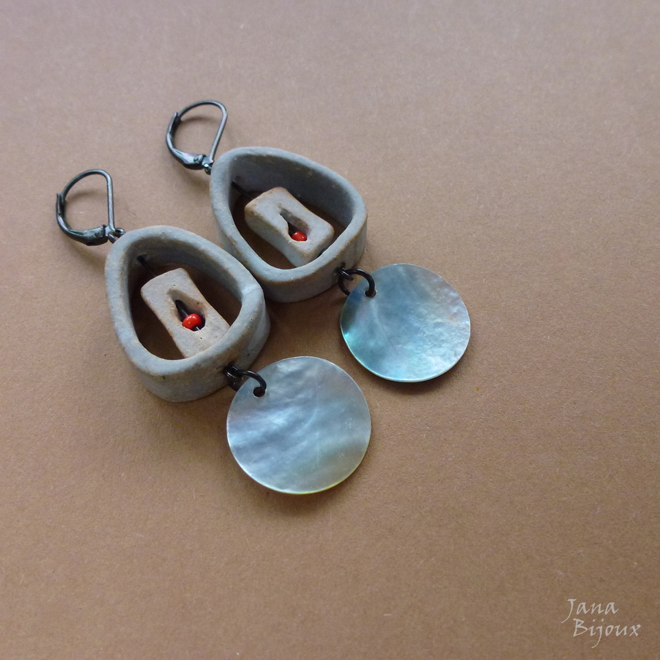 z87 11/05/2016VENDIDOS ( Prodáno)Jana Bijoux Extremamente leve, brincos de cerâmica da grande Janete Dallabona, com conchas metálicas e componentes pretos, comprimento 6,1 cm R$ 25,00