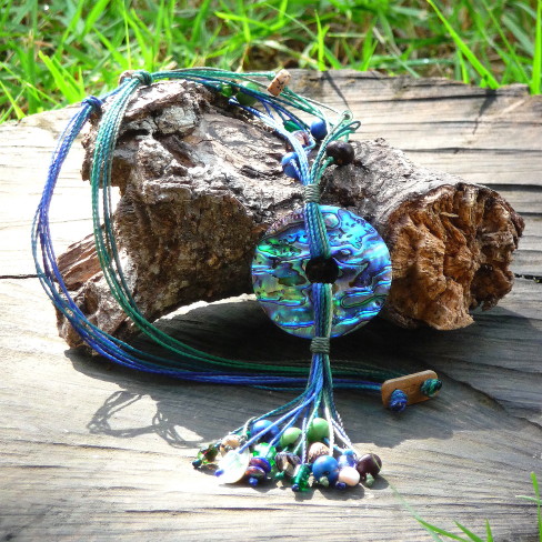 DLOUHÝ NÁHRDELNÍK S PAUA MUŠLÍ, SE SEMÍNKY, SKLEM, PERLETÍ A BEZ JAKÉHKOLIV KOVU. MANDALA S PAUA MUŠLE JE MODROZELENÁ , MĚŘÍ 4,5 CM A JE VE SKUTEČNOSTI O HODNĚ HEZČÍ NEŽ NA FOTCE, ALE JE VELMI TĚŽKÁ VYFOTOGRAFOVAT.