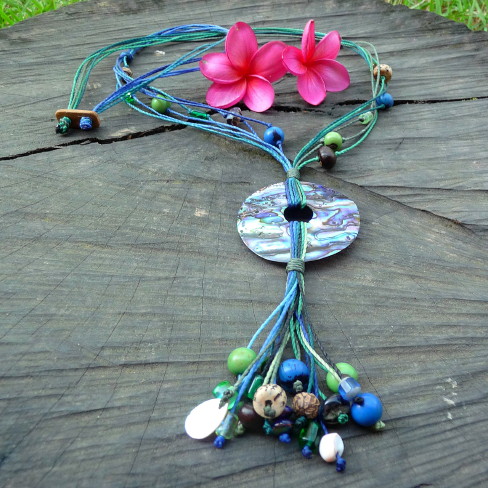 Colar comprido com abalone, vidro, conchas, sementes e sem metal algum R$ 35,00.