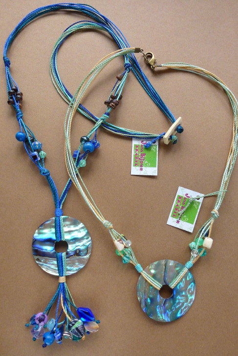 Abalones para Andrea 12/12/2012VENDIDOS ( Prodáno)Jana Bijoux Colar sob encomenda. Um azul, outro verde claro com fios cru. PAUA NA PŘÁNÍ.