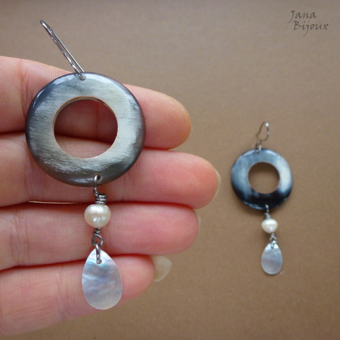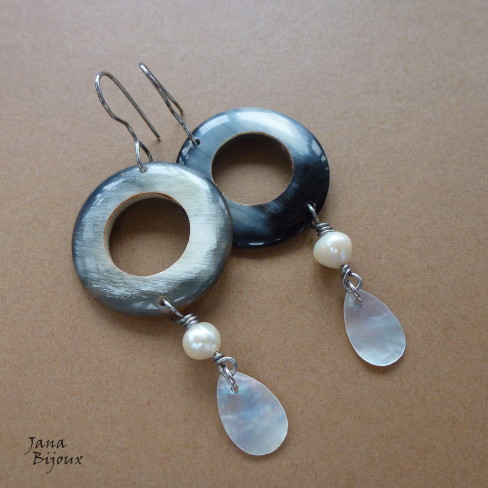 Aç196 19/05/2013VENDIDOS ( Prodáno)Jana Bijoux Brincos super leves, de argolas de chifre, pérolas de água doce, e gotas de conchas.. tudo no aço inox sem uso de componentes comprados, comprimento 7,5 cm R$ 29,00