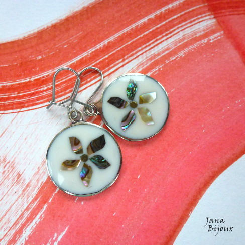 Brincos menores 4 cm, de abalone, alpaca e com fecho feito a mão de aço antialérgico, R$ 25,00.