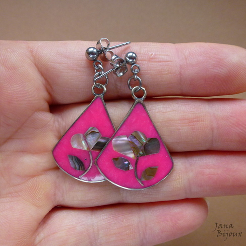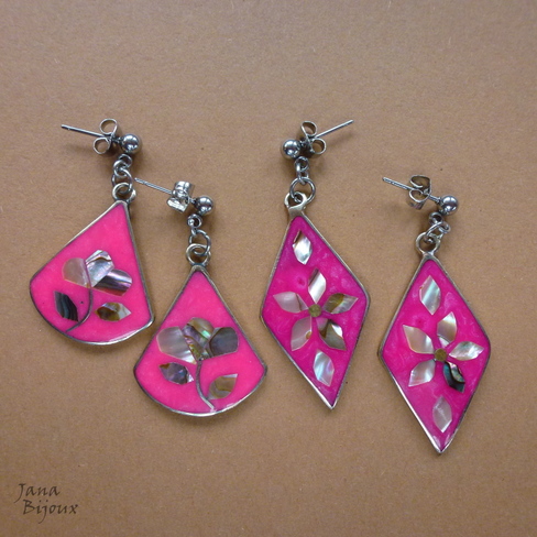 Brincos com flores de abalone de alpaca, com fecho de aço inox R$ 18,00. O comprimento 3,8 cm.