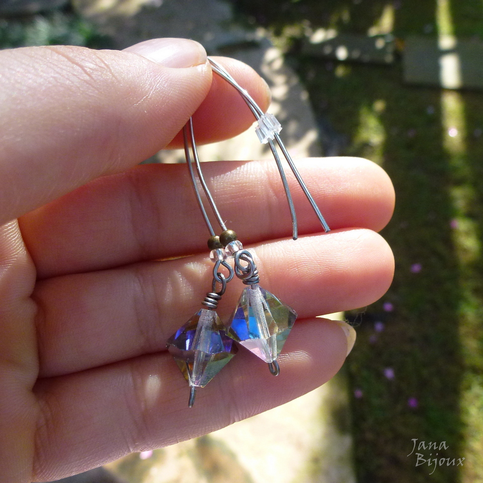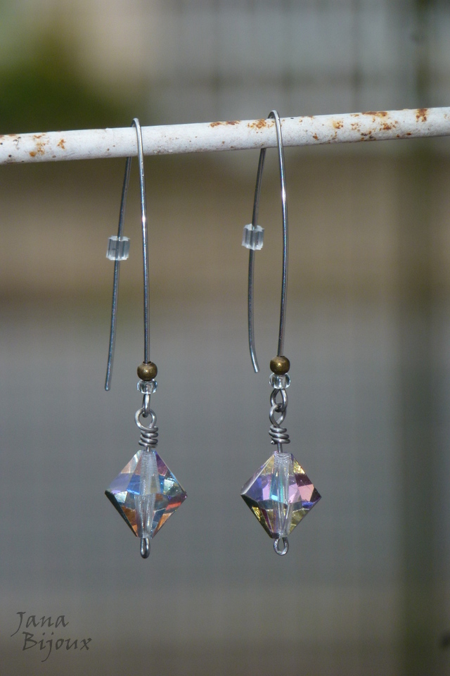Brincos modernos de inox 6,3 cm, com grandes losangos de cristais furta cor, tarraxa de silicone. R$ 18,00