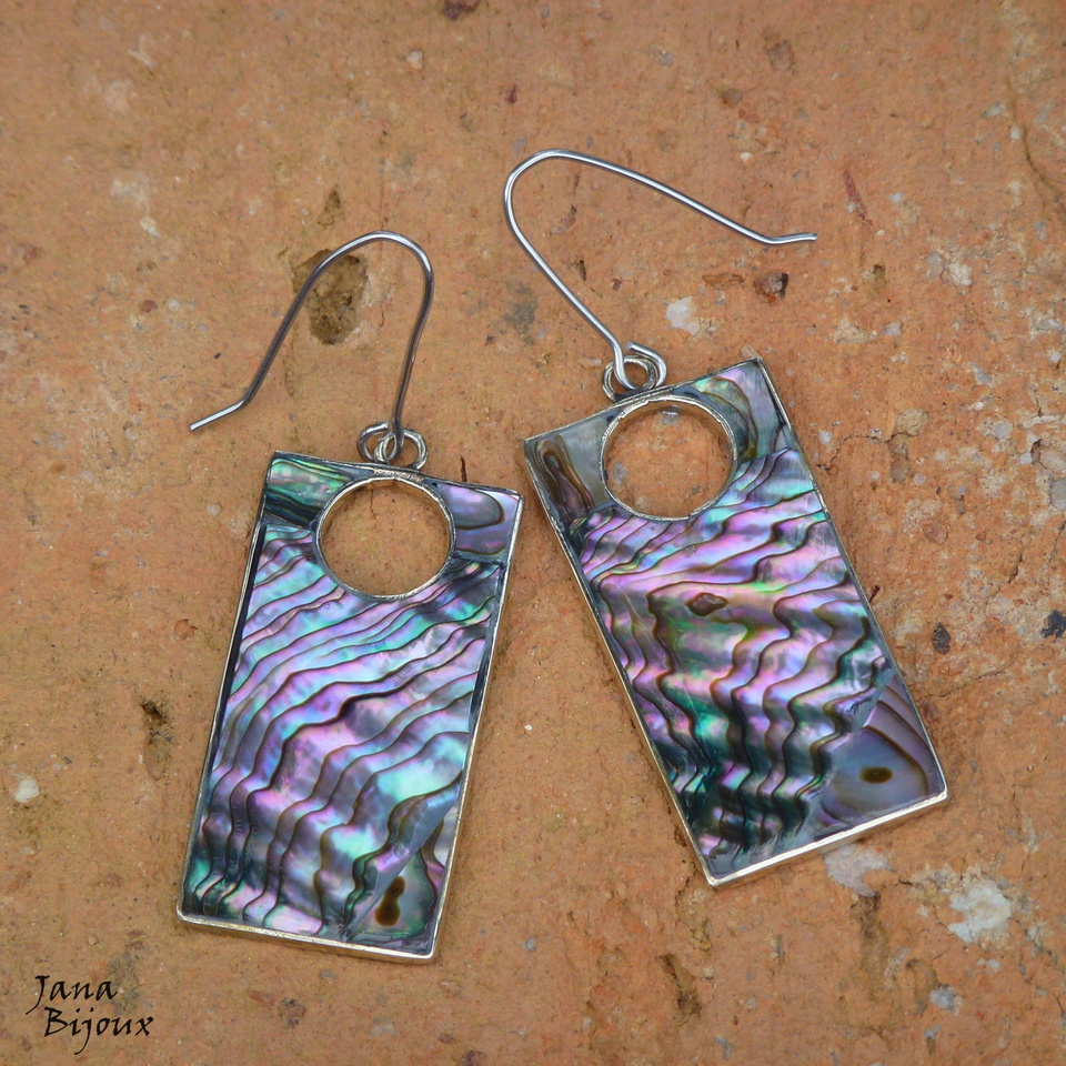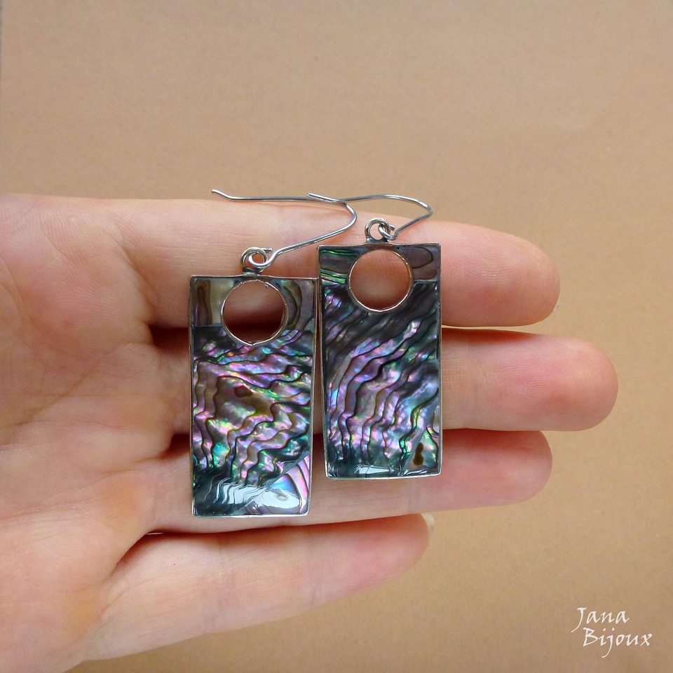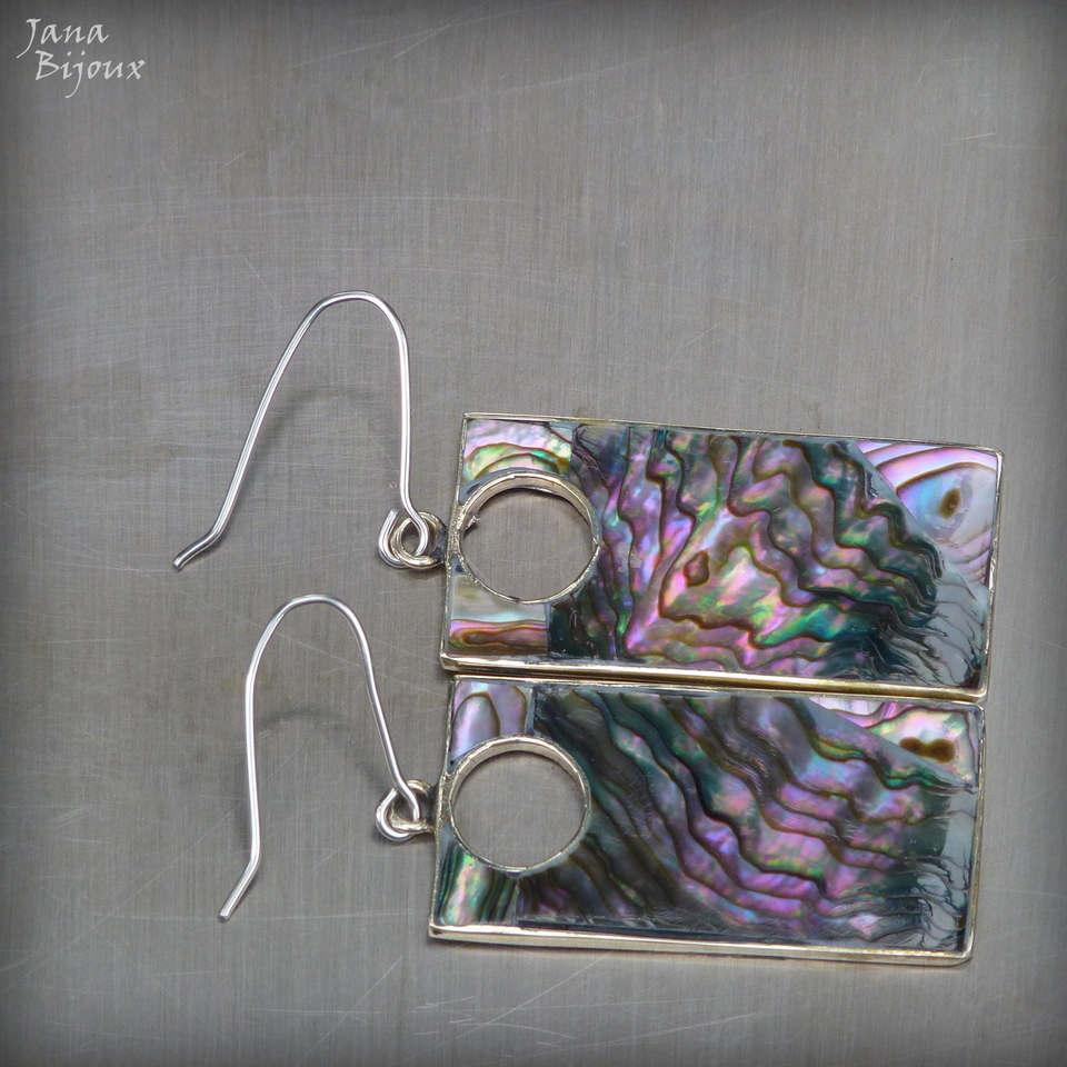 Brincos compridos de alpaca com fecho de aço inox torcido a mão, abalone, comprimento 5,8 cm R$ 28,00.