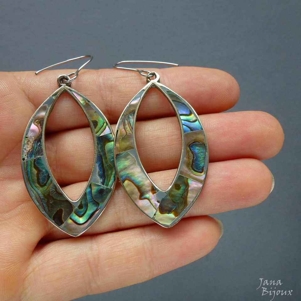 Brincos grandes 6 cm e leves de alpaca com abalone, fecho de aço inox feito a mão com tarraxa de silicone.  R$ 26,00