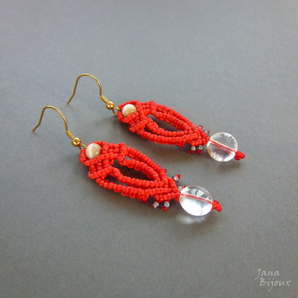 Brincos de macramé de fio vermelho claro, anzois de aço inox dourado, comprimento 6,6 cm, na ponta quartzo natural que reflete a luz e ilumina rosto R$ 29,00