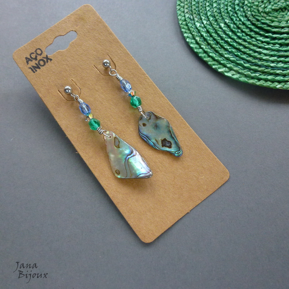 Aç377 03/10/2017VENDIDOS ( Prodáno)Jana Bijoux Brincos de aço inox com tarracha, de comprimento 5,4 cm com vidro e lascas irregulares de abalone. Super leves e únicas R$ 26,00