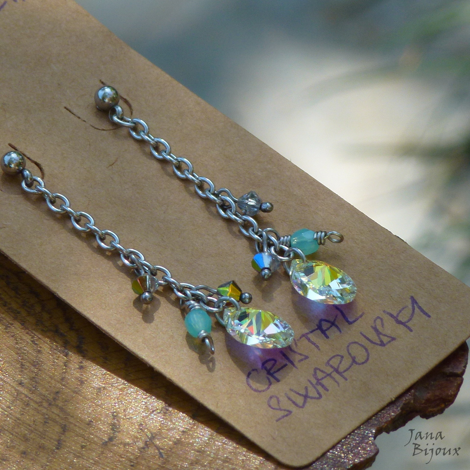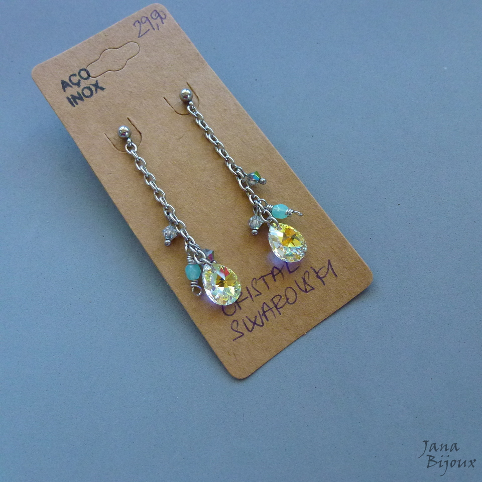 Brincos compridos 5,8 cm, de aço inox com gotas de Swarovski – AB crystal (furta-cor) de 1,2cm. Cristais PRECIOSA e fecho de tarracha R$ 29,90