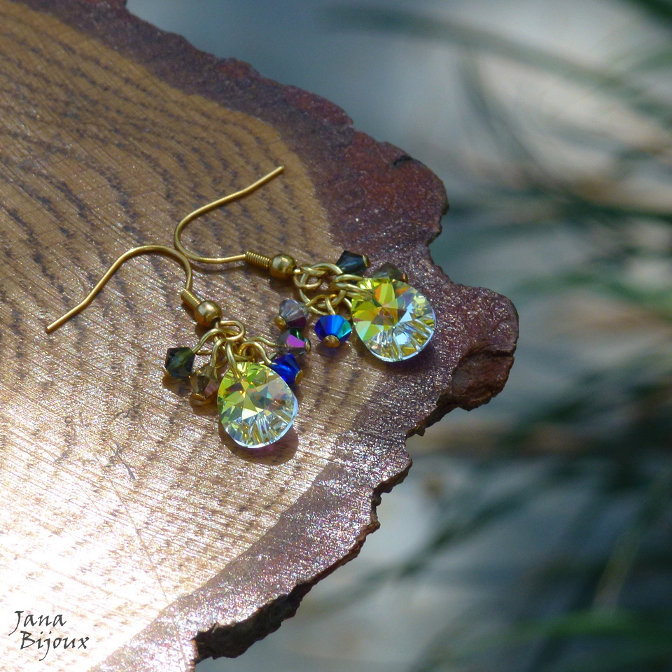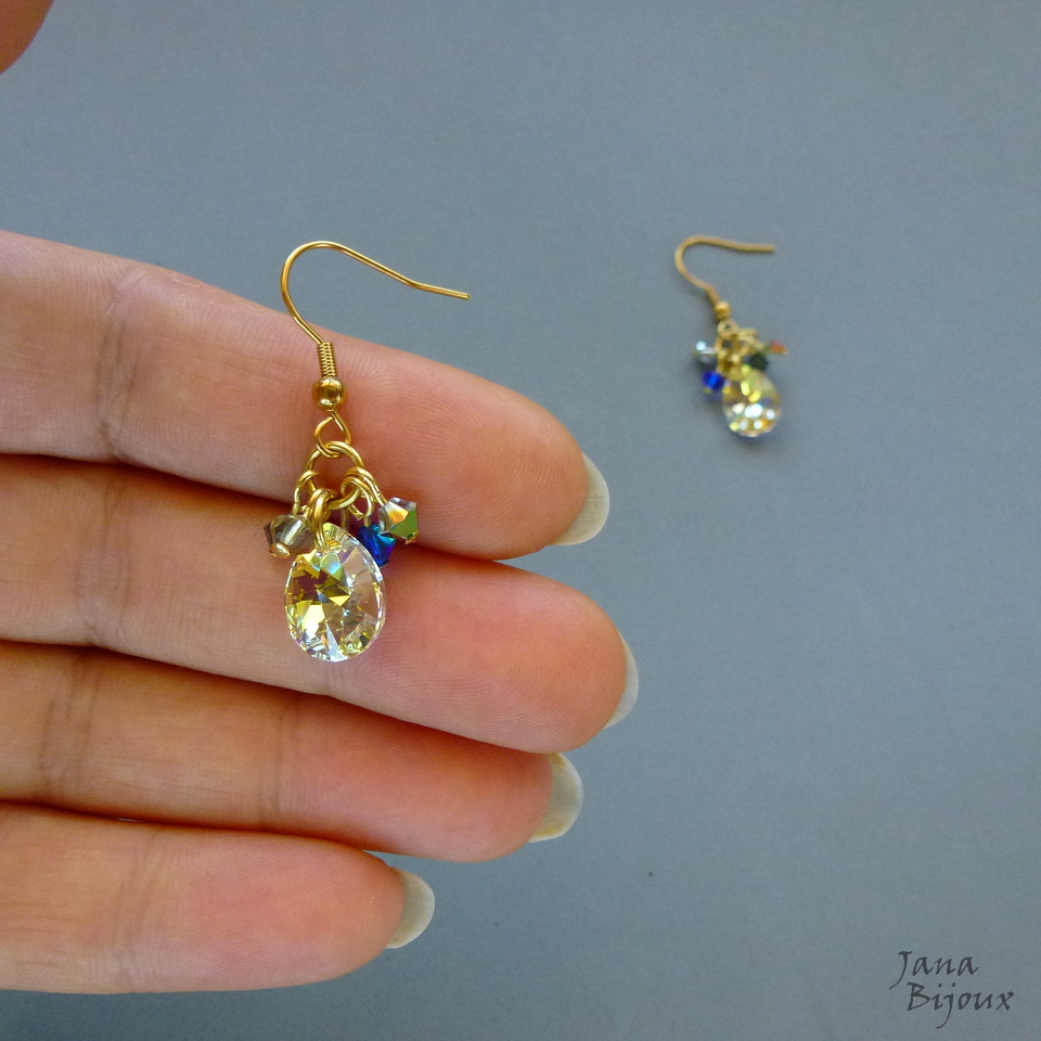 Brincos compridos 3,8 cm, de gotas de Swarovski – AB crystal (furta-cor) de 1,2cm. 8 cristais PRECIOSA e fecho de anzois banhado à ouro, restante dos brincos bijuteria banhada à ouro R$ 27,00