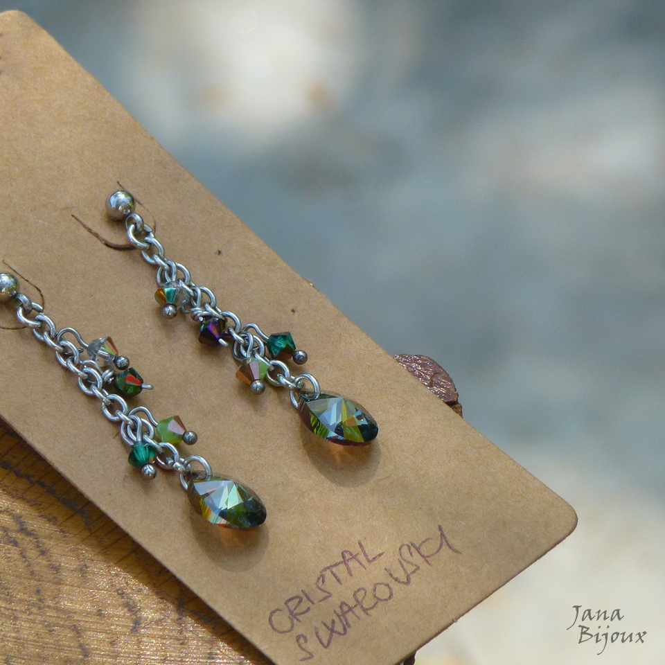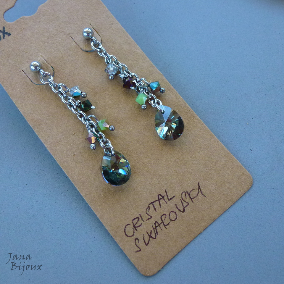 Brincos compridos 5cm, de aço inox com gotas de Swarovski – na cor IRIDESCENT GREEN (verde fumê ) de 1,2cm. Cristais PRECIOSA colorido e fecho de tarracha R$ 33,00