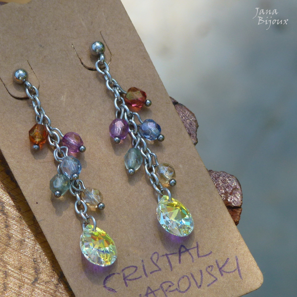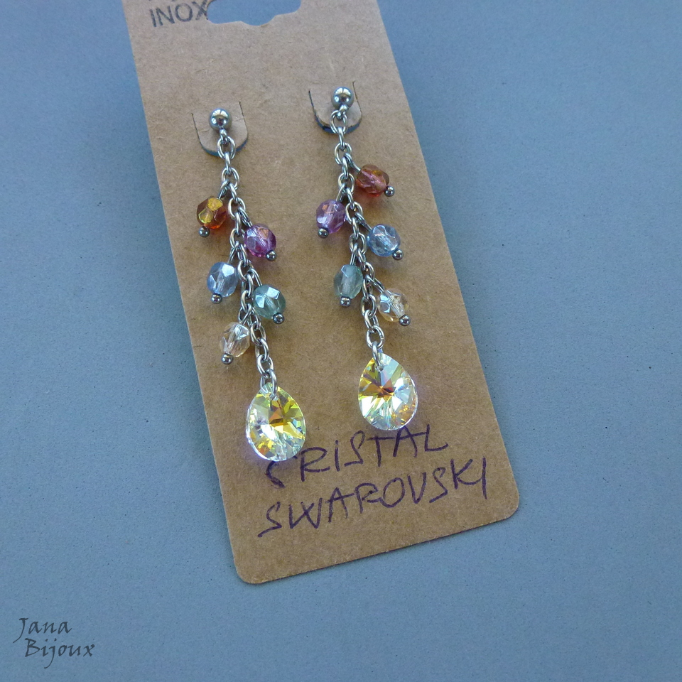 Aç396 10/12/2017VENDIDOS ( Prodáno)Jana Bijoux Brincos de aço inox, compridos 5,8 cm, leves, com cristais de Swarovski AB- crystal (furta cor) de 1,2 cm e cristais degredê R$ 34,00