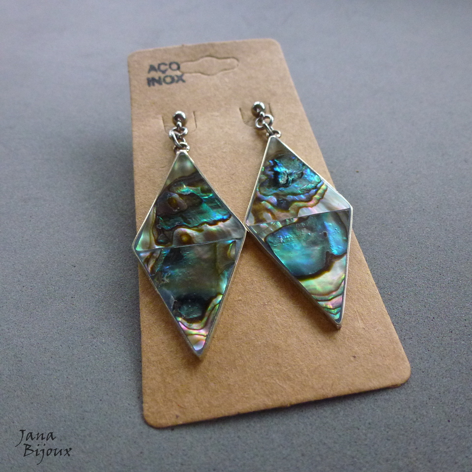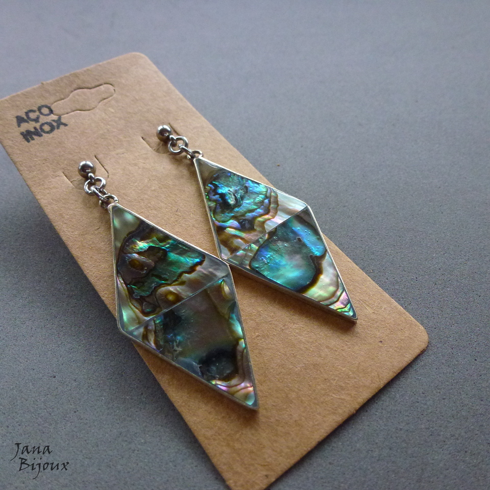 Aç415 26/06/2018VENDIDOS ( Prodáno)abalone, aço inox, brincão, brincos grandesJana Bijoux Brincos grandes, compridos 6,5 cm de alpaca com fecho de aço inox, abalone R$ 33,00.