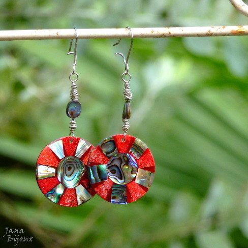 Brincos compridos, todos feitos com aço cirúrgico e abalone e coral. Comprimento 7,5 cm R$ 28,00.
