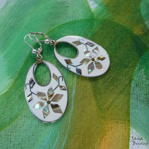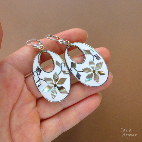 Brincos grandes de abalone, alpaca e com fecho de prata 925, comprimento 6 cm e largura 2,8 cm R$ 38,00.
