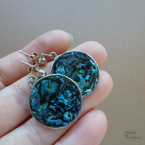 Brincos compridos 3,5 cm de alpaca, com abalone, fecho de prata com tarraxa R$ 33,00