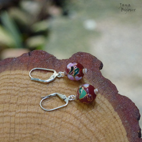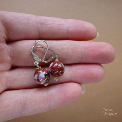Brincos delicados de de prata 925/000, cloisonné cinnabar (=marrom avermelhado) e mini tubinhos feitos de conchas. Comprimento 3,1 cm, só a bola de cloisonné tem 1 cm e é luxuosa. R$ 32,00