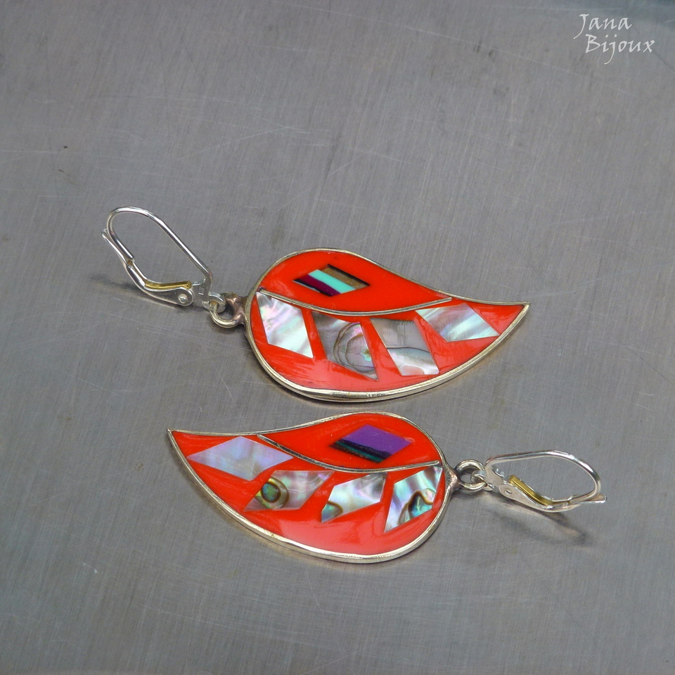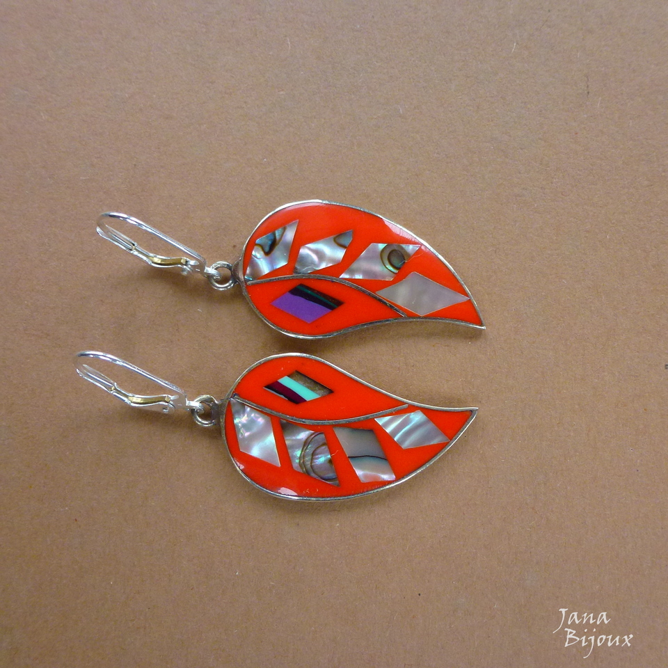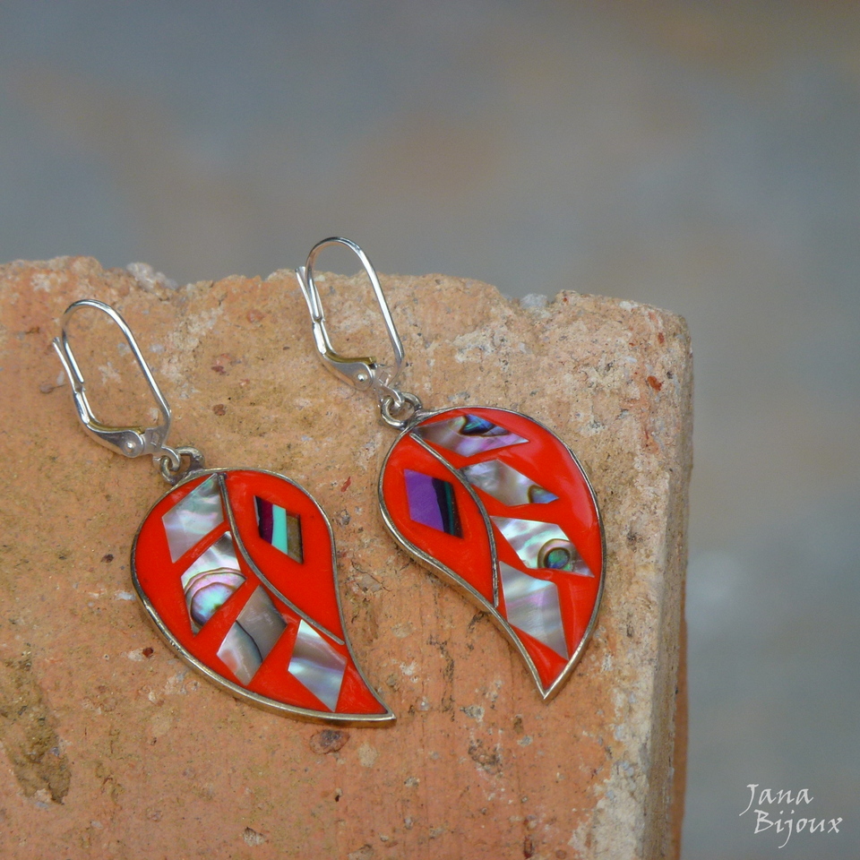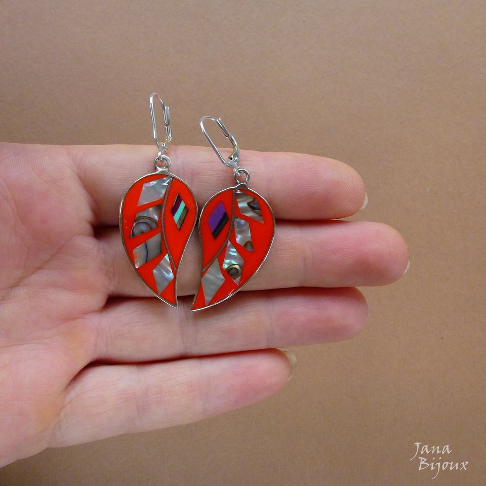 Brincos laranjas de abalone, alpaca e com fecho de prata 925, comprimento 5 cm R$ 35,00.
