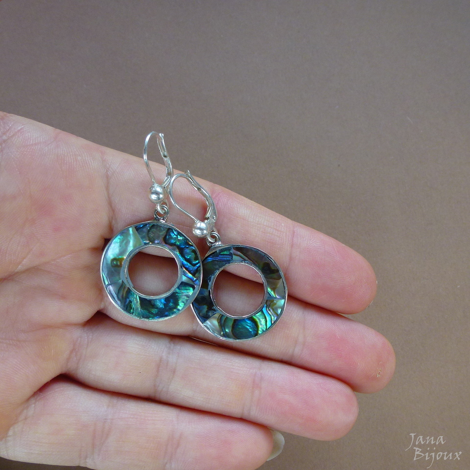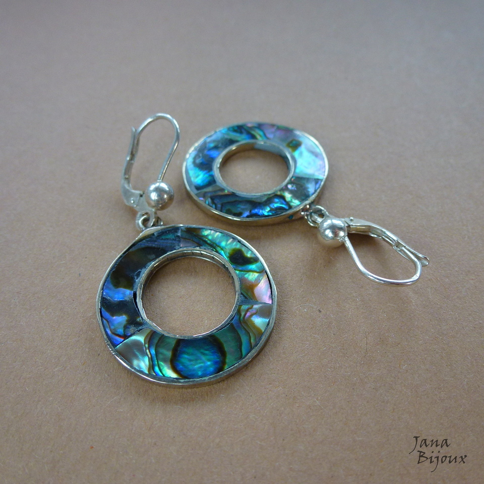 Ag175 13/12/2015VENDIDOS ( Prodáno)Jana Bijoux Brincos de abalone, alpaca e com fecho de prata 925, comprimento 4,1 cm R$ 33,00.