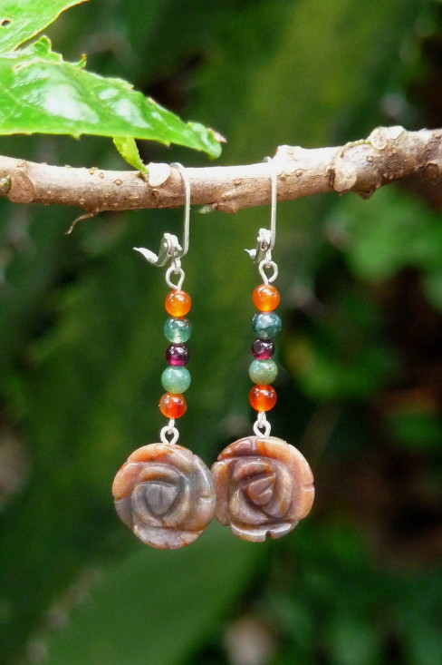 Brincos de prata,  jaspe, ágata e almandina com comprimento 5,6 cm R$ 32,00.