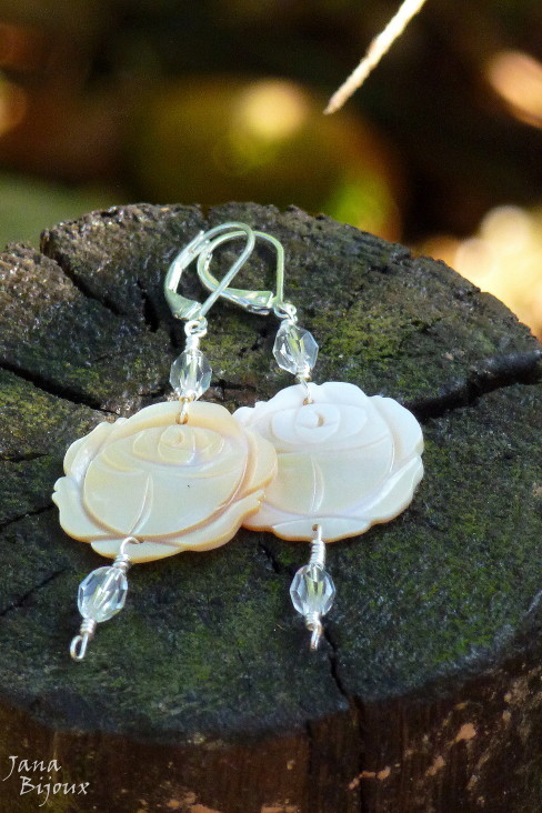 b241 03/10/2011VENDIDOS ( Prodáno)Jana Bijoux Brincos com arames torcidos a mão, banhados à prata, cristal e flores de madrepérola R$ 19,90. Compr. 7,2 cm.