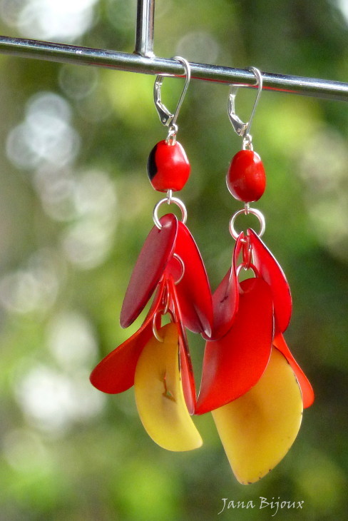 Brincos leves de jarina tingida e sementes. Cores vermelho, laranja e amarelo, mas tenho outras cores tmb R$ 18,00.