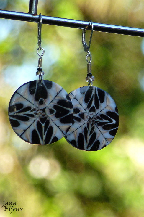 Brincos com mosaico de conchas, vidro, comprimento 6 cm e componentes banhados à prata R$ 20,00.