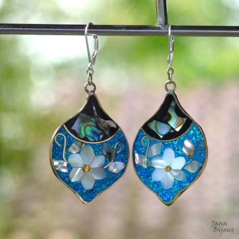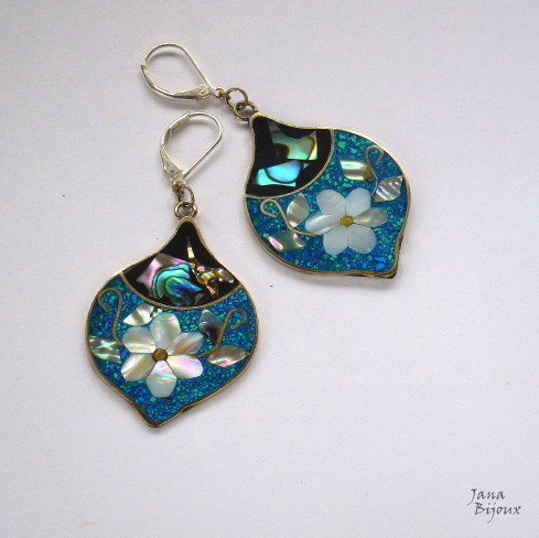 b257 25/10/2011VENDIDOS ( Prodáno)Jana Bijoux Brincos com flores de abalone, comprimento 6,5 cm com fecho banhado à prata R$ 22,00. RESERVADO PAUA MUŠLE ALAPAKA A POSTŘ. ZAVÍRÁNÍ.