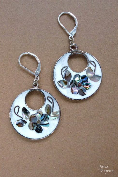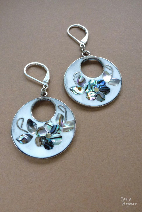 b258 25/10/2011VENDIDOS ( Prodáno)Jana Bijoux Brincos com flores de abalone, comprimento 5,1 cm com fecho banhado à prata R$ 20,00. PAUA MUŠLE ALAPAKA A POSTŘ. ZAVÍRÁNÍ.