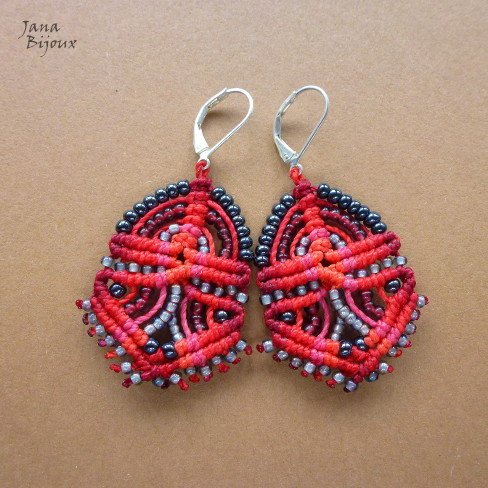 Brincos médios de micromacramé em cores vermelhas, com diversas tipo de miçangas. Acabamento banhado à prata, comprimento 5,9 cm e 2,7 cm de largura. R$ 29,90