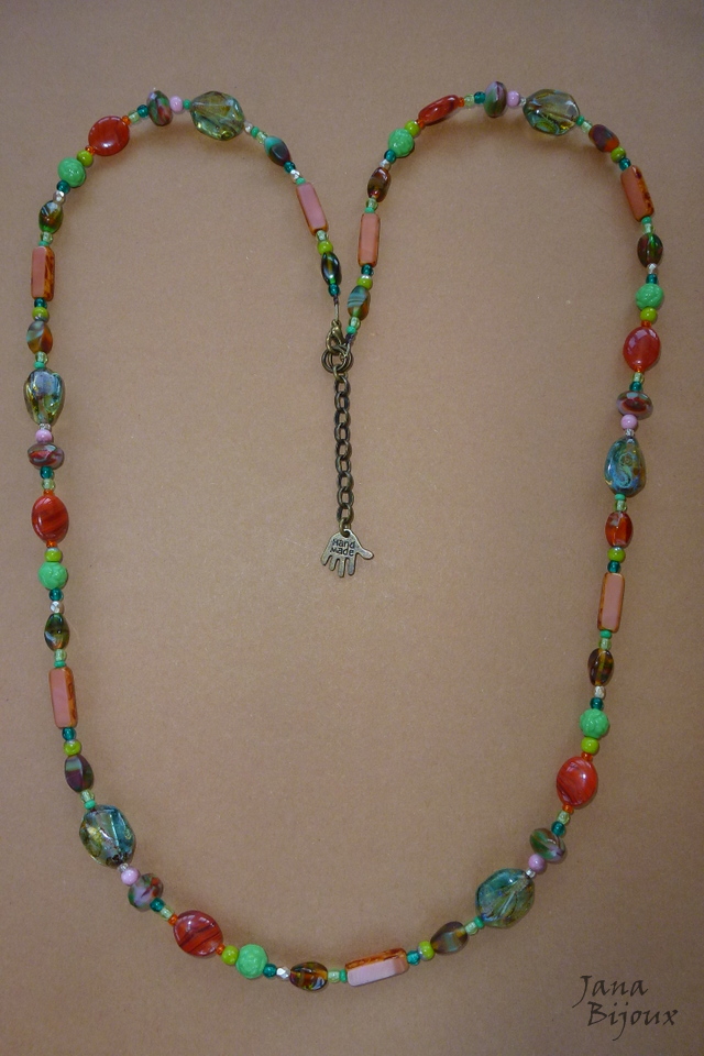 c1009 26/02/2015VENDIDOS ( Prodáno)Jana Bijoux Colar comprido 75 cm + 4 cm de corrente, com mistura de peçes de vidros importados e pingente de mão HANDMADE R$ 39,90