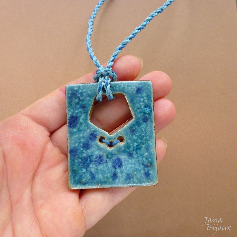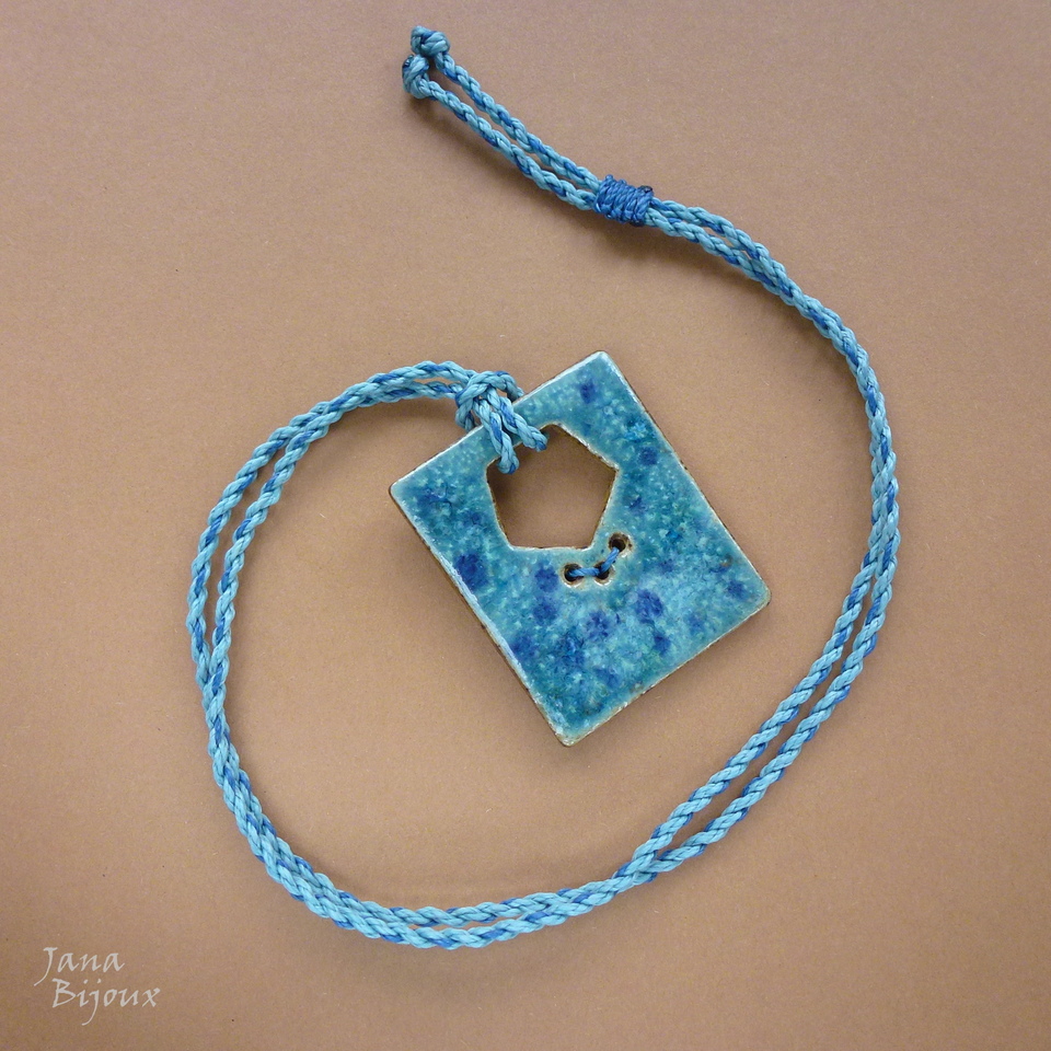 c1063 21/11/2015VENDIDOS ( Prodáno)Jana Bijoux Colar minimalísta com comprimento ajustável, cerâmica da Janete Dallabona. O medalhão mede 5,5 cm por 4,5 cm. Colar abre até 76 cm, fios de cores azuis 25,00
