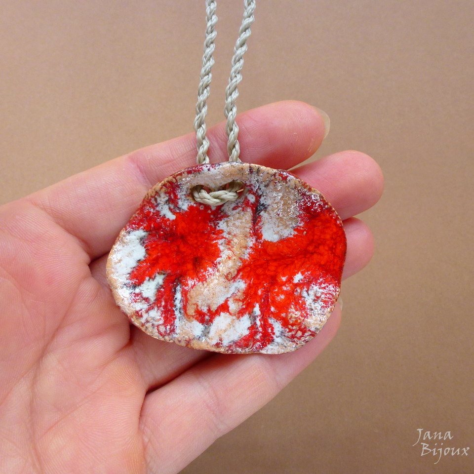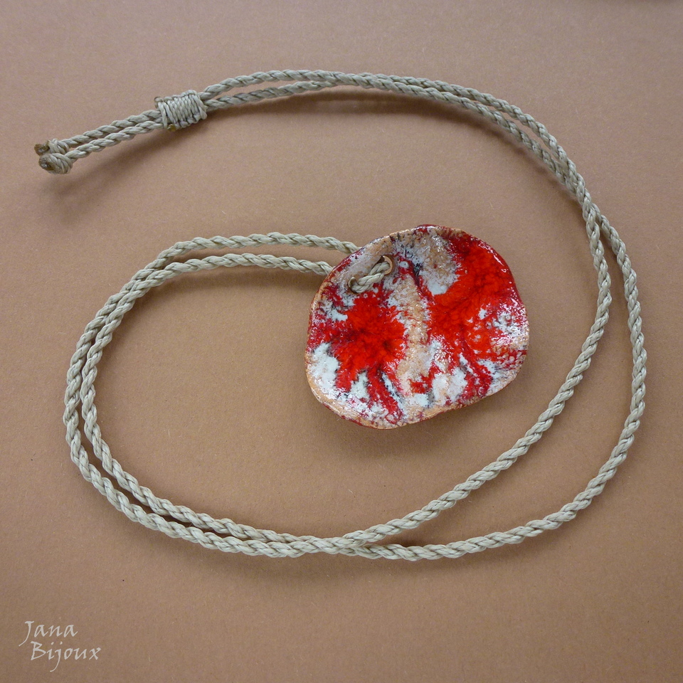 c1065 21/11/2015VENDIDOS ( Prodáno)Jana Bijoux Colar minimalísta com comprimento ajustável com cerâmica. O medalhão é irregular, formato orgânico, com ar mais artístico e menos certinho, mede 5,5 cm por 4 cm. Colar abre até 84 cm, nós na pontas, fios de cor cru acizentado 18,00