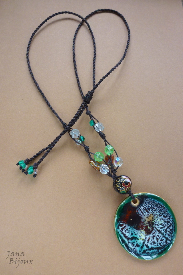 Colar com cerâmica do alteliê da Janete Dallabona, cloisonné grande cor preta, vidros e cristal .
