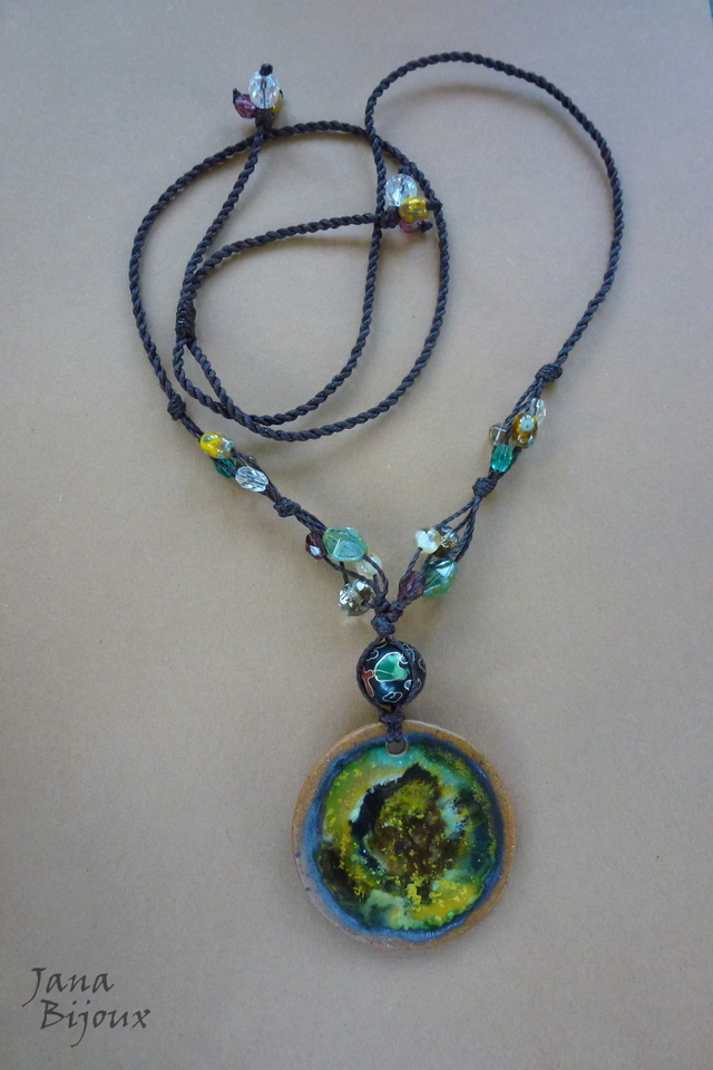 Colar com cerâmica do alteliê da Janete Dallabona, cloisonné grande cor preta, vidros e cristal .