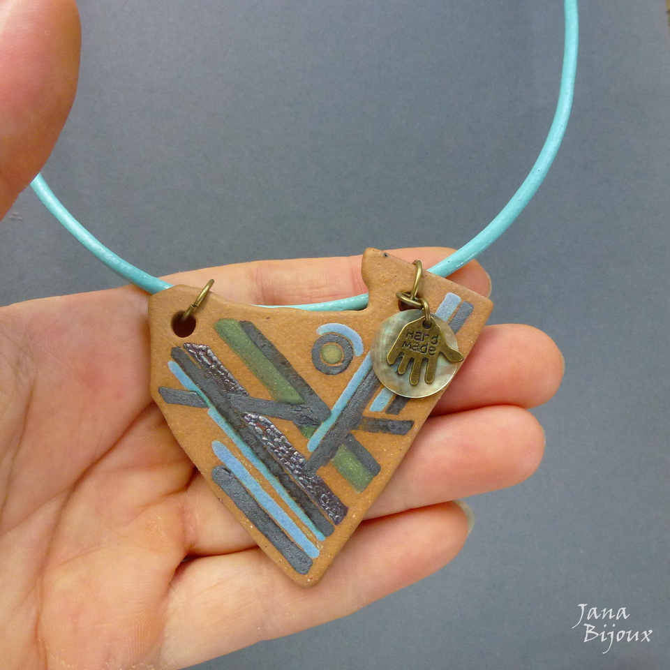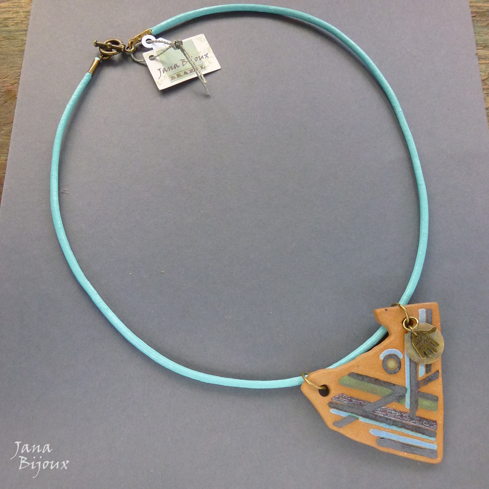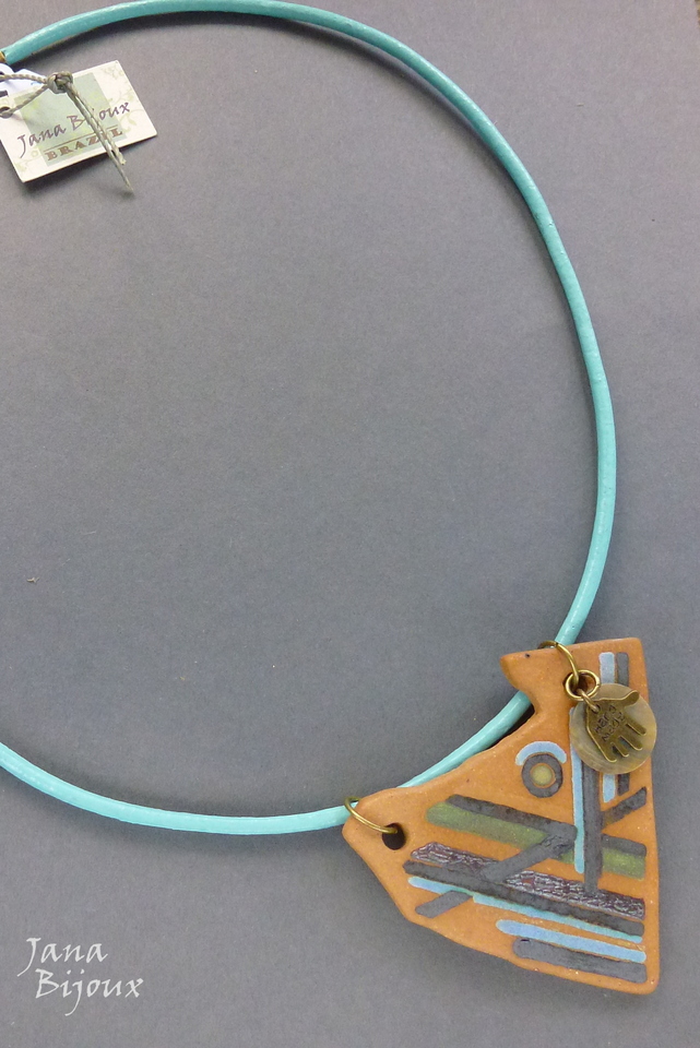 Colar médio de 52 cm de couro azul claro com cerâmica artística (do ateliê Janete Dallabona), assimétrica com desenho moderno, concha e pingente de mãozinha HAND MADE, acabamento em ouro velho R$ 32,00.