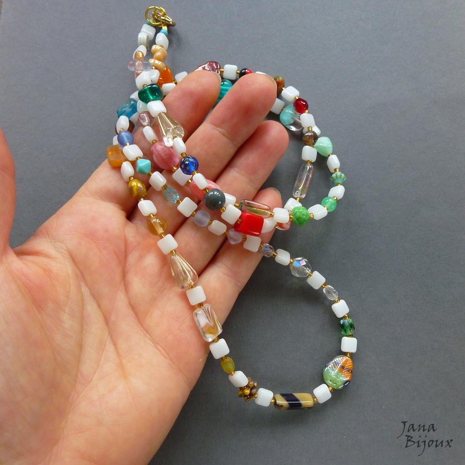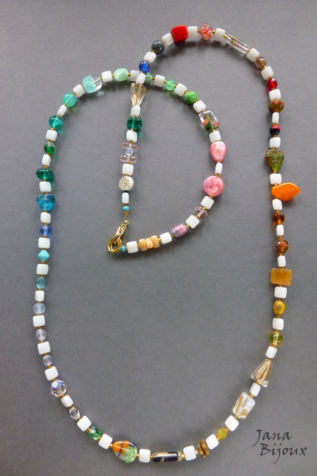 Colar colorido com mix grande de formatos e tipos de vidros importados, juntados em degrade intercalados pelo vidro branco quadrato achatado e miçangas vintage, douradas. Fecho dourado, comprimento 88 cm R$ 42,00
