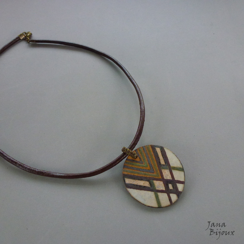c1226 18/10/2017VENDIDOS ( Prodáno)cerâmica da Janete Dallabona, colar com cerâmica, colar curto, couro, feito a mão, macraméJana Bijoux Colar médio, com couro importado, de 51 cm, com linda cerâmica da Janete Dallabona (4,4 cm). Acabamento em ouro velho, o fecho maior 1,5 cm para look mais luxuoso e manuseio mais fácil. Alça feita a mão de macramé SUPER PEÇA ÚNICA, ALTA TEMPERATURA