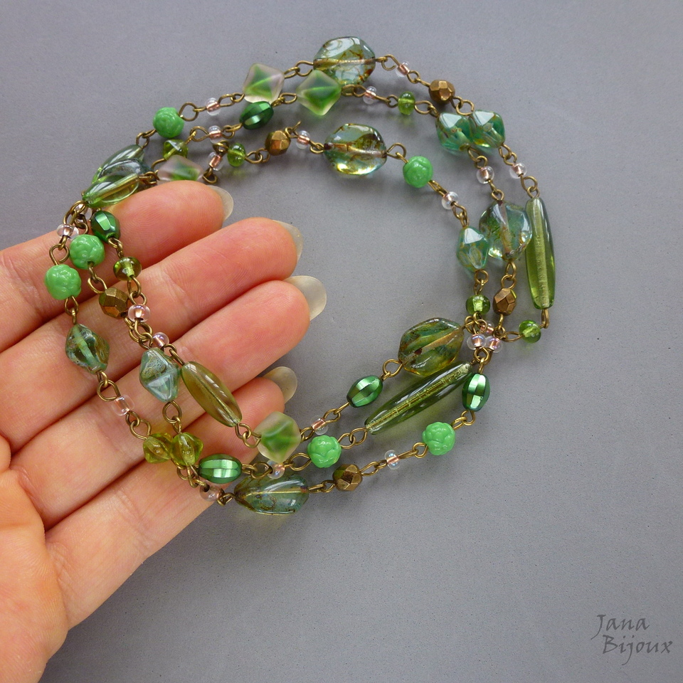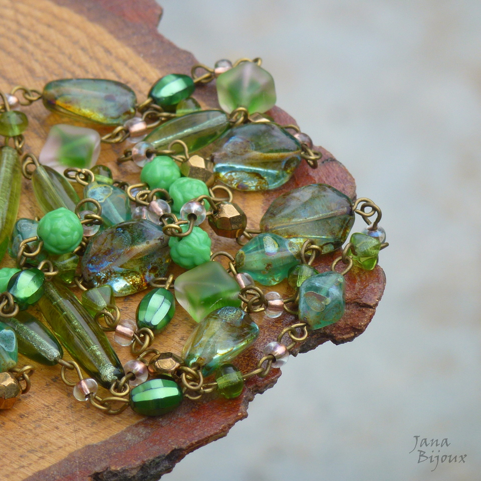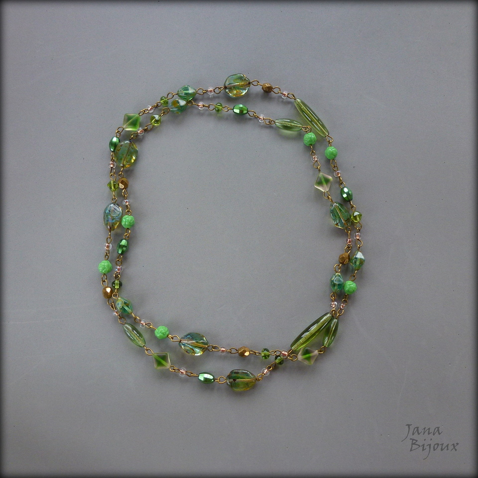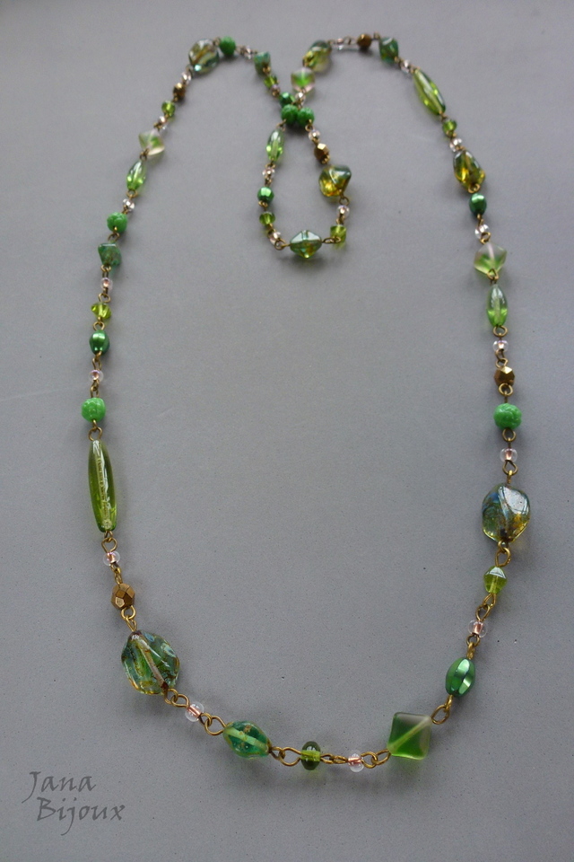 c1232 22/10/2017VENDIDOS ( Prodáno)Jana Bijoux Colar comprido 90 cm, delicado, com vidro importado da República Tcheca, em tons de verde, diversos formatos e assimetria, componentes ouro velho.. e argolas. Colar tem ar de vintage e não tem fecho R$ 47,00